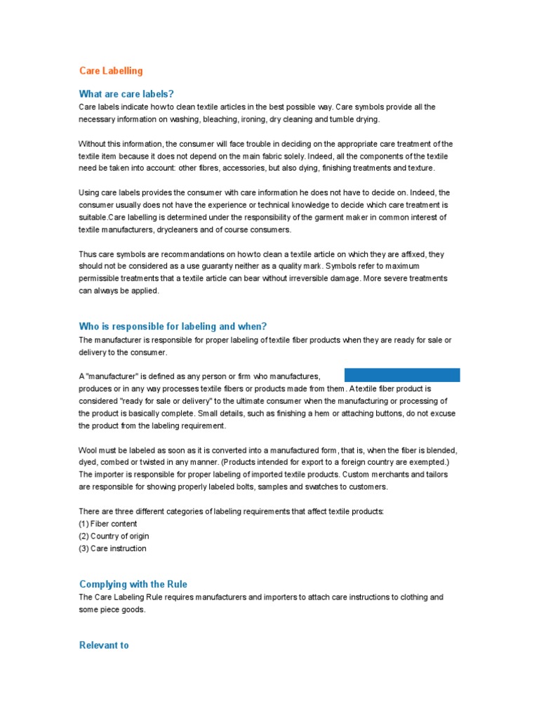 Care labelling for clothing & textiles | Product Safety Australia Labelling. The mandatory standard requires that textile products including clothing, textiles, furnishing and suede skins, leathers and furs must have adequate care labelling instructions in English attached to the item. Care symbols alone are not sufficient. However, extra information such as care symbols or instructions in other languages may ...
